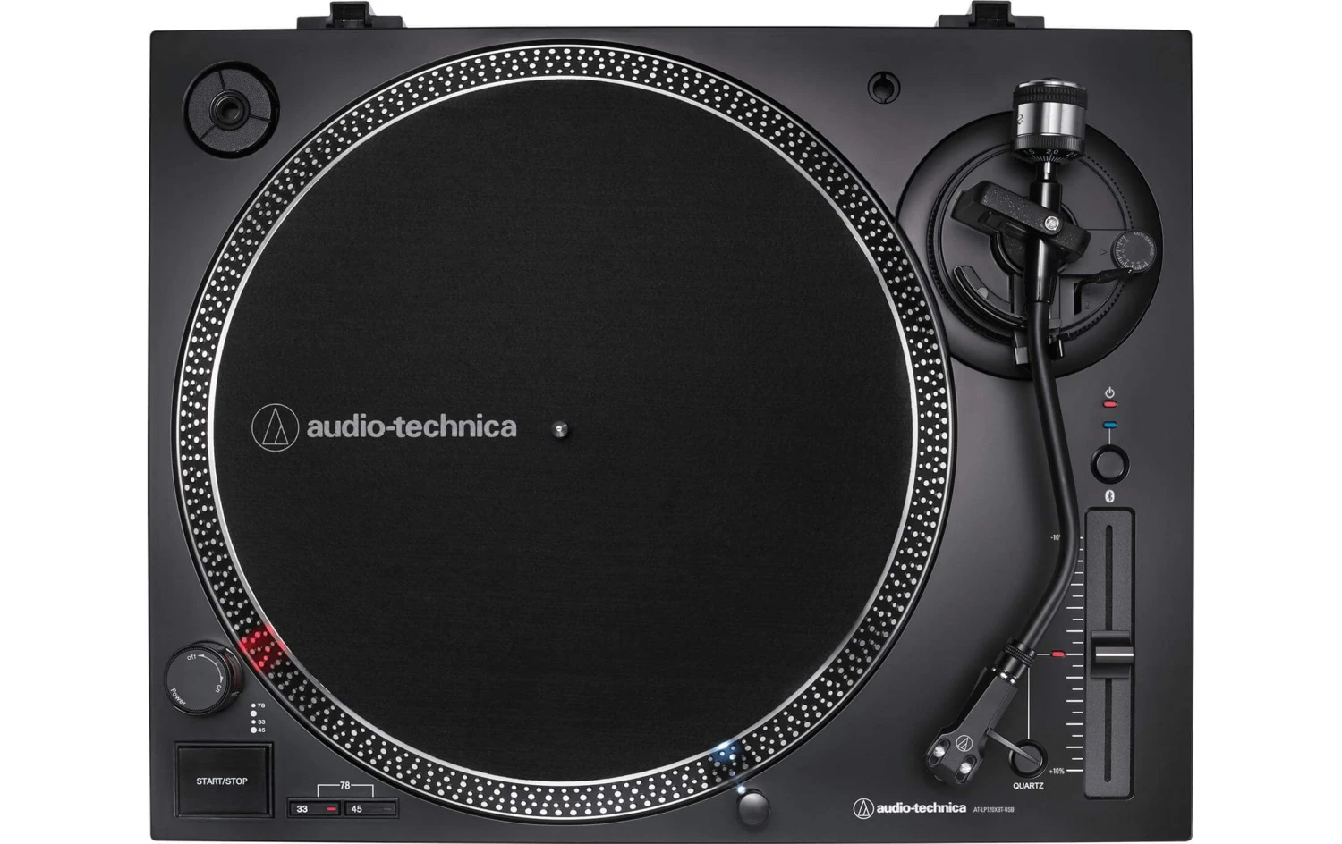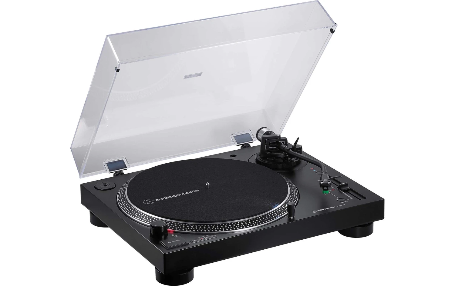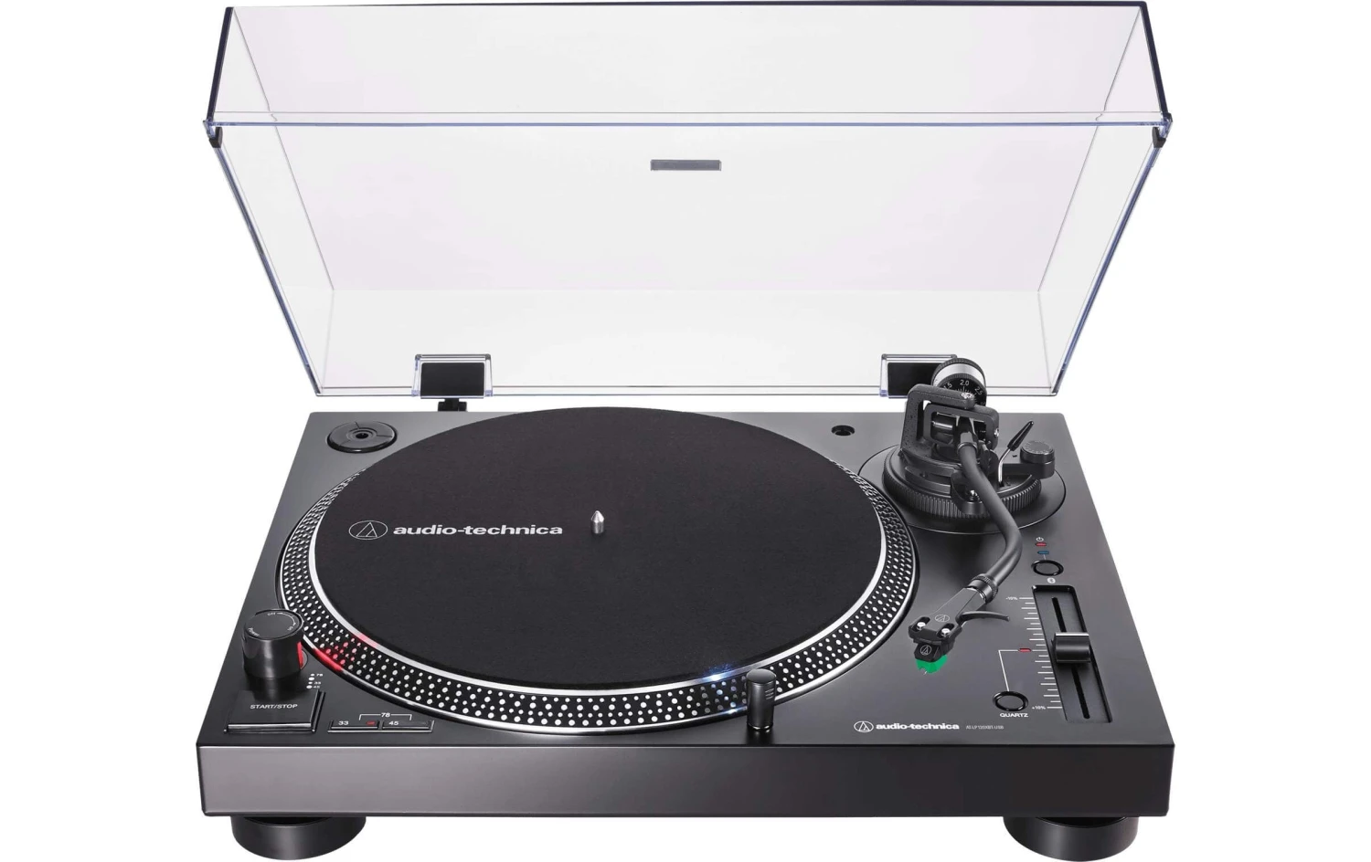 – S-förmiger Tonarm mit einstellbarer Auflagekraft (3.5 – 8.5 g); inklusive Headshell AT-HS6; einstellbare Anti-Skating-Steuerung (0 – 4 g); Start/Stopp-Knopf; Stroboskop-Geschwindigkeitsanzeige; Pitchfader mit wählbarer Pitchrange (+-8% oder +- 16%) mit Pitch-Lock-Taste