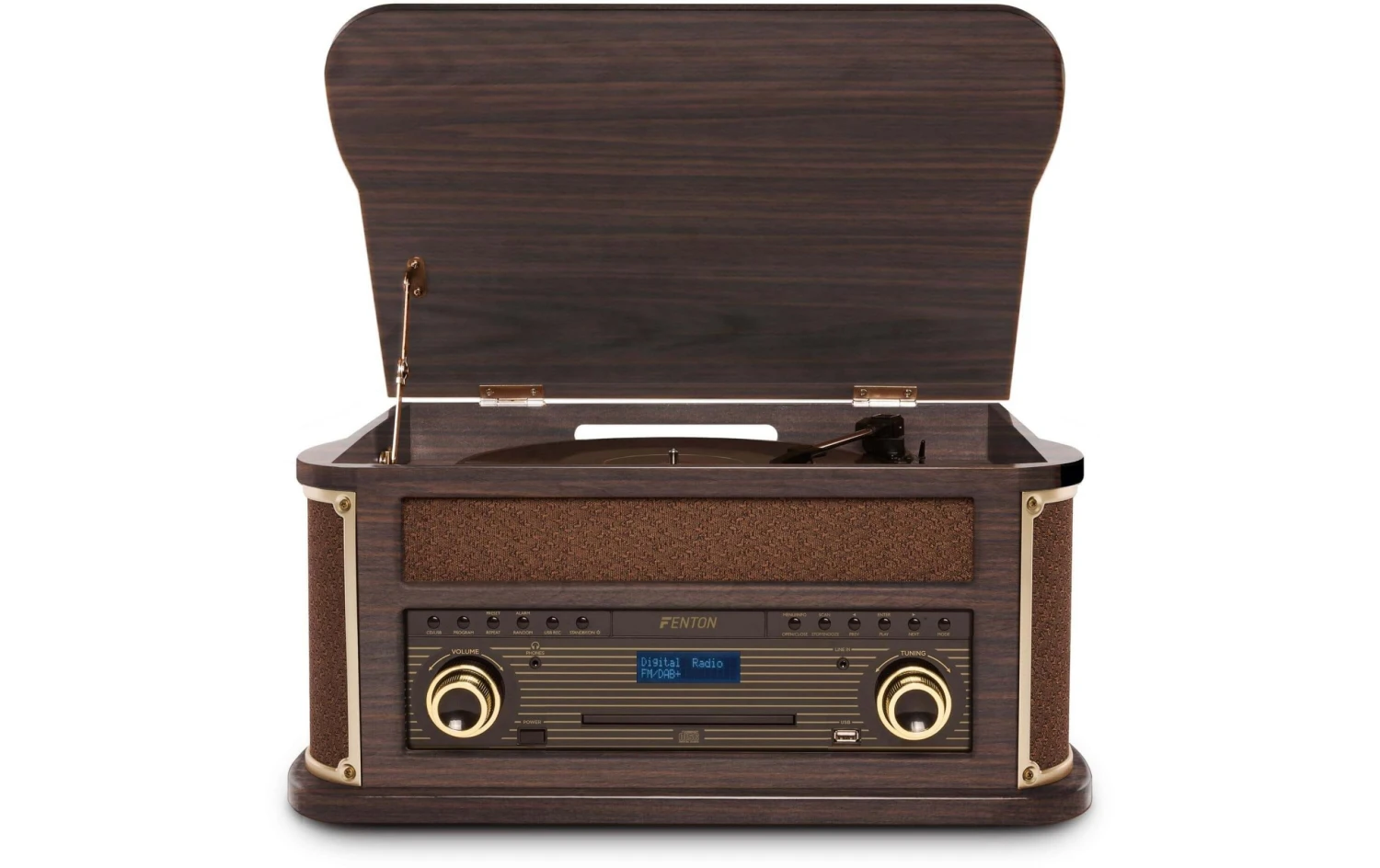 – 3 Geschwindigkeiten (33 1/3, 45 und 78 U/min), Radio-Tuner (FM und DAB+), CD- und Kassettenspieler, Bluetooth Konnektivität, Media-Player (USB-Anschluss)